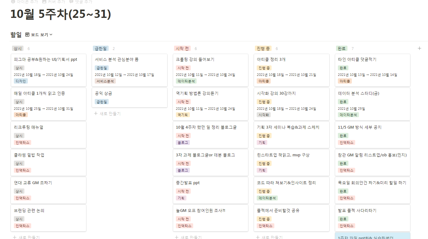 11/5 GM 방식 공지, 참관 GM 조 공유, 놀 GM 오프 참여인원 조사 등 짜잘한 업무들을 지속적으로 해나갔던 거 같다. 이런 짜잘한 일들을 하루 할일의 틈틈에 적어놓고, 뭔가 딥한 일 하기 귀찮을 때 이런 공지 올리거나 연락돌리기를 해나갔던 듯!( 이제 좀 다양한 일이 있어도 그걸 우선순위 정해가며 잘 처리해나갈 수 있어진거 같다.) 발표 플젝 사다리 타기 같은 자잘한 일들을 실행할때도 누군가의 눈엔 별개 아닐 수 있겠지만, 이걸 사다리로 정하는 이유 등등을 최대한 상세하면서도 비효율적이지 않게 전달해주려고 했던 거 같다.