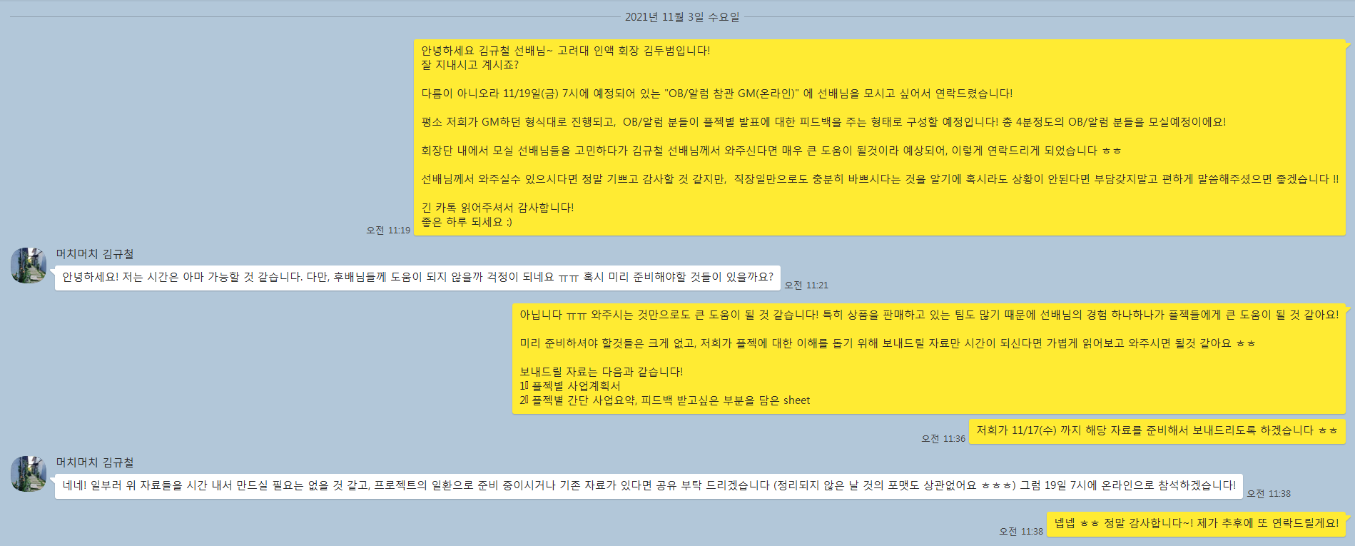 예전에 서강대 회장이 보내줬던 참관 요청 문자를 참고해서, 선배님께 보낼 문자를 드렸다. 나름 회장단하면서 하나 는것이 이런 연락 부분 아닐까 싶다. 인사말-> 연락 목적-> 구체 내용 및 연락이유-> 부담 덜어드리기 -> 연락 마무리 등! 이런게 나름 체화된 것 같다.