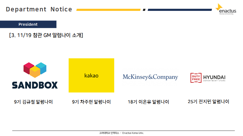 이 회의를 하면서 느꼈던 건 다들 알아서 나몰래 뭔가의 일을 벌이고 있었다는 거...!! 기분 좋은 배신감이 었다. 지남이형은 나름 대로 TR 해줬던 맥킨지 선배에게 참관 GM 부탁을, 수진누나는 멘토링을 위한 진로 희망 조사를 준비하고 있었다. 뭔가 다들 자기의 스페이스에서 최선을 다하고 있는 모습을 보니까 다시 회장단 할만하다 라는 느낌이 들었다.