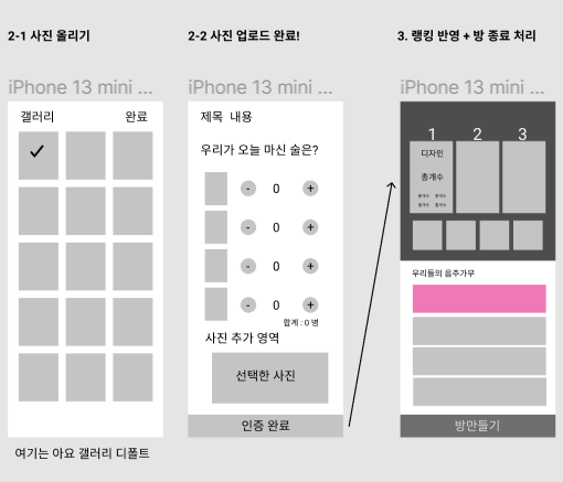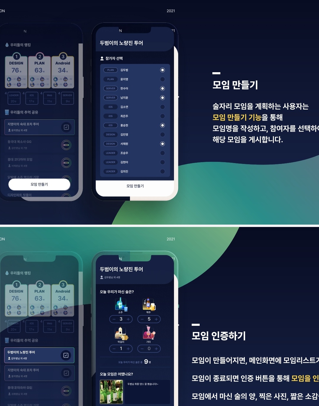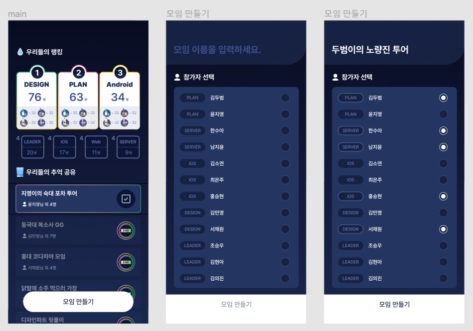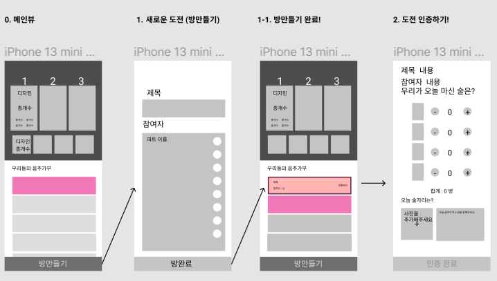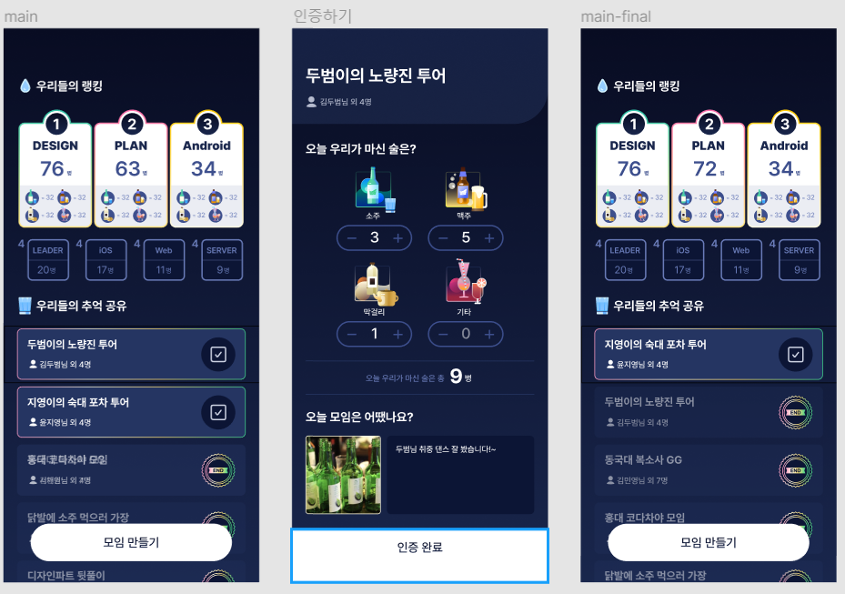 또 아무래도 솝커톤이다 보니, 구현가능한 개발 범위, 기능위주로 회의가 돌아갔다. 크게 들어갔던 기능은 2가지모임 만들기(모임명, 참석인원 선택 후 모임 리스트에 추가) 모임 인증하기( 마신 술병수 카운팅해서 기록, 홈화면 파트별 술랭킹에 카운팅해서 들어감)