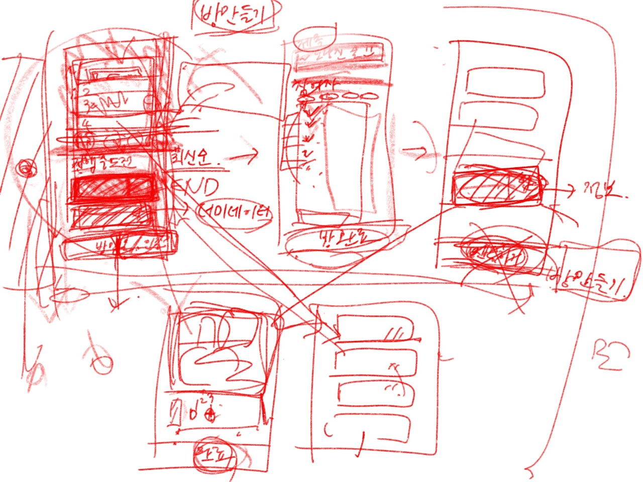 실제로 처음엔 논의한 내용을 바탕으로 왼편과 같이 아이패트로 민영(디자이너)가 그려줬다. 그런뒤 서버 파트, 기획자와 함께 픽스를 하는 과정을 거쳤고 이 큰 그림을 못들은 사람들도 모두 다 이 서비스가 어떤플로우로 흘러가는지 들어야 한다 생각했기에, 서비스 플로우를 한번 더 전체에게 설명하는 과정을 부탁했다.( 잘했다고 생각한 부분, 기획자는 모든 사람 머릿속에 동일한 그림을 넣어줄 수 있어야 한다고 생각한다!)