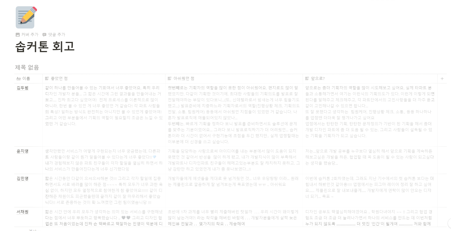 솝커톤이 끝나고 약 2주 후 팀 회고를 하는 시간을 가졌었다. 전반적으로 회고를 하면서 느낀점은, "내가 몰랐던 부분들이 많구나. 그리고 모든 파트가 아쉬웠던 점이 있었구나" 였다.