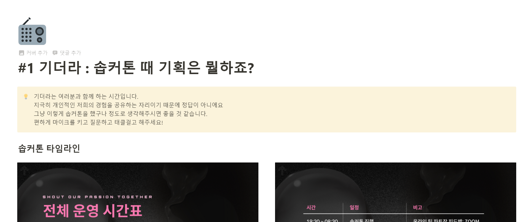 솝커톤 전.. 진짜 너무 막막했었는데, 기획파트의 남걸, 유진 , 현아 선배림들께서 기스더라디오를 열어줬다. 진짜 솝커톤이 막막했던 YB들에게 한줄기 빛이 아니었을까..?? 그 소중한 말들 들으면서 솝커톤 전엔 어떻게 해야하고, 솝커톤 땐 어떻게 해야하고, 솝커톤 후엔 어떻게해야하는지 조금은 간접체험할 수 있었던 거 같다. 또, 진짜 고마웠던 부분은 솝커톤 끝나면 "기획의 역할에 대해 현타가 오고, 기획자로서 내가 재능이 없나?" 라는 생각이 들 수도 있다는 걸 OB 선배들이 말해줬었다. 그런 얘기를 해줬어서, 솝커톤 끝나고 그나마 타격이 덜했던 거 같다. 이게 내 역량 문제가 아니라, 상황문제에 더 가깝다는걸 한번 들어서..!