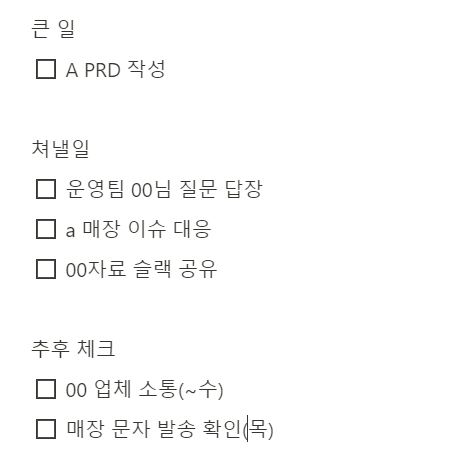 예를 들어, 수요일까지 작성해야 하는 PRD(기획서) 작성은 큰 일(우선순위 높은 일)로 두고 잊지 않고 시간을 배분하려 했다.