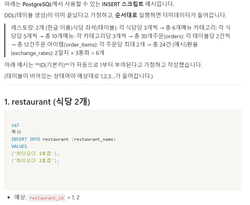 원하는 더미데이터에 대한 양식에 대한 최소요건(ex. 식당은 몇 개 만들어야 하고, 식당 별 테이블 개수와, 메뉴 개수는 뭘로 할지, 식당 메뉴는 양식으로 만들어줘야 하는지 등) 정도만 프롬프트에 넣었다.
