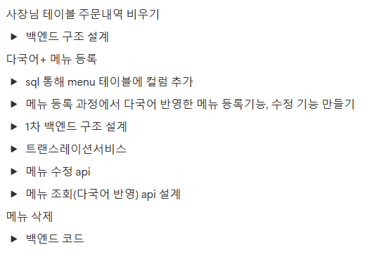 사장님이 메뉴 등록을 하는 로직 동작시, GPT를 호출해서 해당 메뉴의 메뉴명/메뉴 설명등을 영/중/일로 번역하게 만들었다. 그리고 번역된 값을 db에 저장함으로써, 프론트엔드 UI 상에서 특정 언어를 고를 시 선택한 언어에 해당하는 메뉴명/메뉴 설명 값이 내려오도록 만들었다.