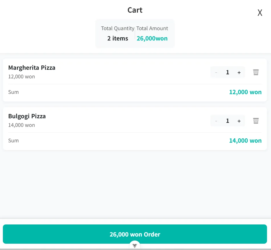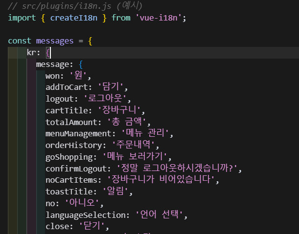 그 외에 프론트엔드상에 하드코딩되어 있는 값들 (ex. ~~ 원, "닫기" 버튼, "주문하기" 버튼) 등은 Vuejs의 I18n 라이브러리를 이용했다. 특정 언어를 선택 시, 선택한 언어에 해당하는 값이 등장하게 해 뒀다.