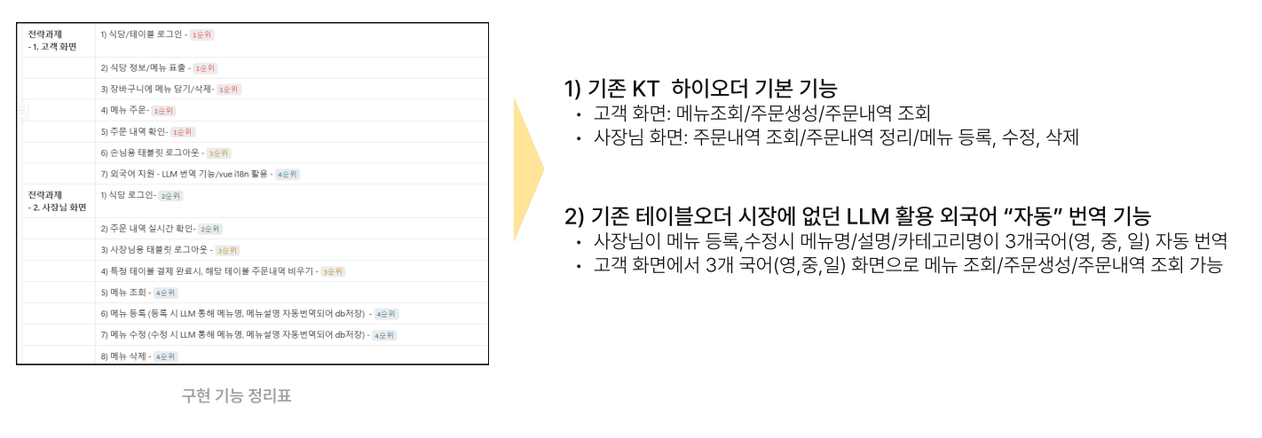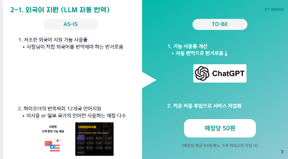 크게 1) KT 하이오더의 기본 기능과 2) LLM을 활용한 외국어 "자동" 번역 기능을 구현하려 했다.