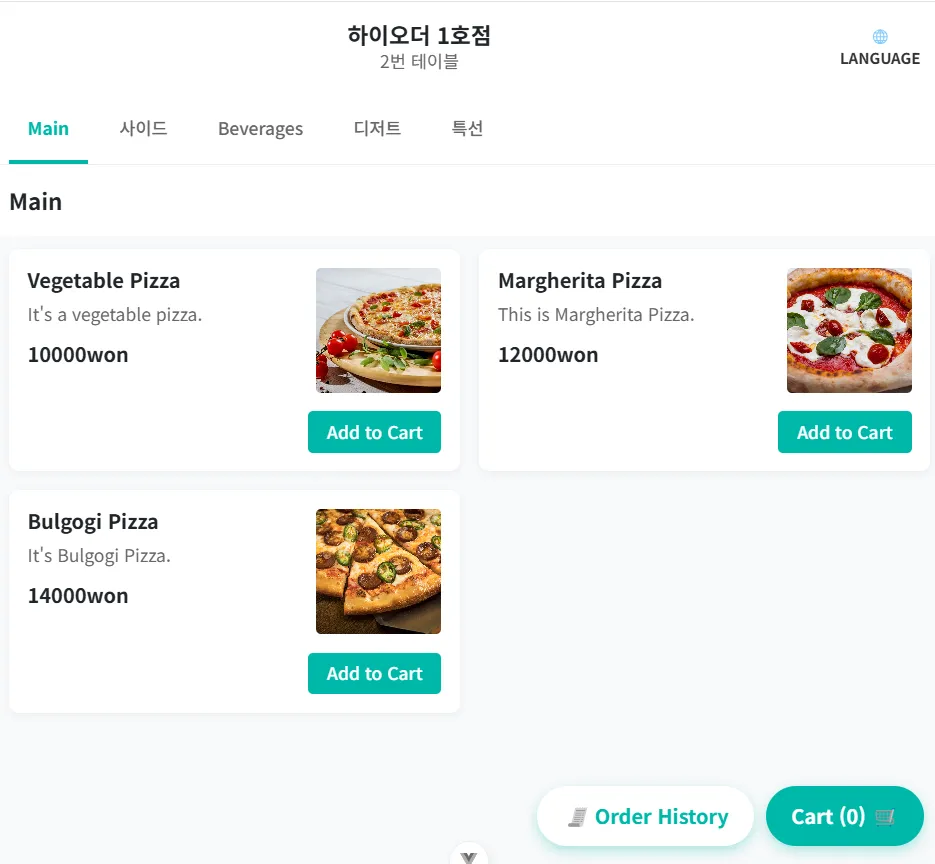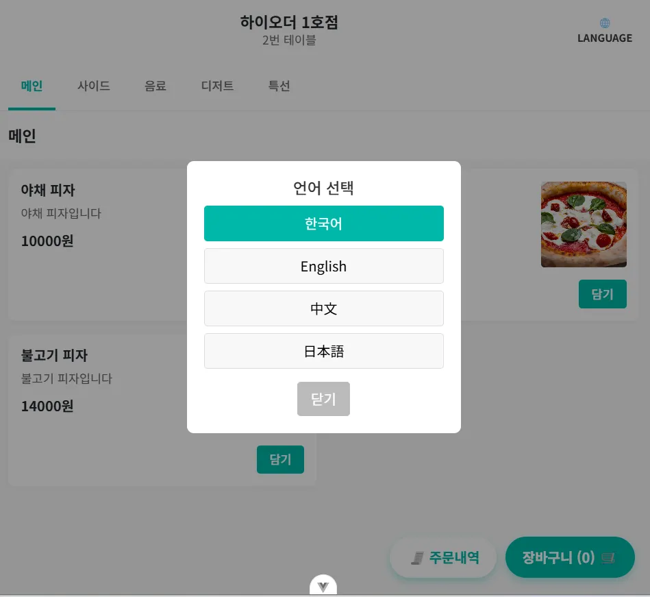 이 2가지 방식을 통해 "메뉴명/메뉴설명" 같이 백엔드에서 내려오는 값과, "주문하기/닫기" 같은 프론트엔드 하드코딩 값을 모두 번역해 외국어 지원을 아래 UI와 같이 구현할 수 있었다.