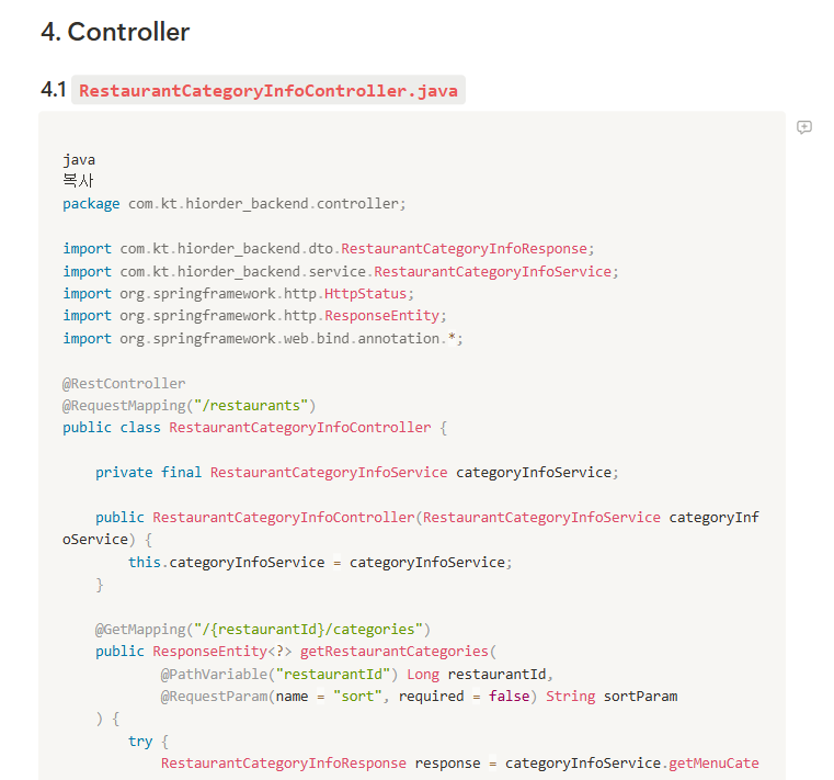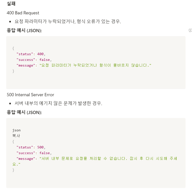 내가 한 것은 GPT가 전달해 준 API 명세서를 노션 양식에 잘 복붙 하고, 성공/실패 메시지를 조금 더 내 입맛에 맞게 커스텀해달라고 요청하거나, 혹시나 빠진 요소가 있을 때 추가를 요청하는 정도였다.