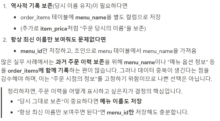 menu 테이블에 이미 기록되고 있는 menu_name 값을, order_items(주문 상세) 에도 하나의 컬럼(속성)으로 기록할 것인가? (주문 당시 시점의 메뉴명을 히스토리 남기기 위해)