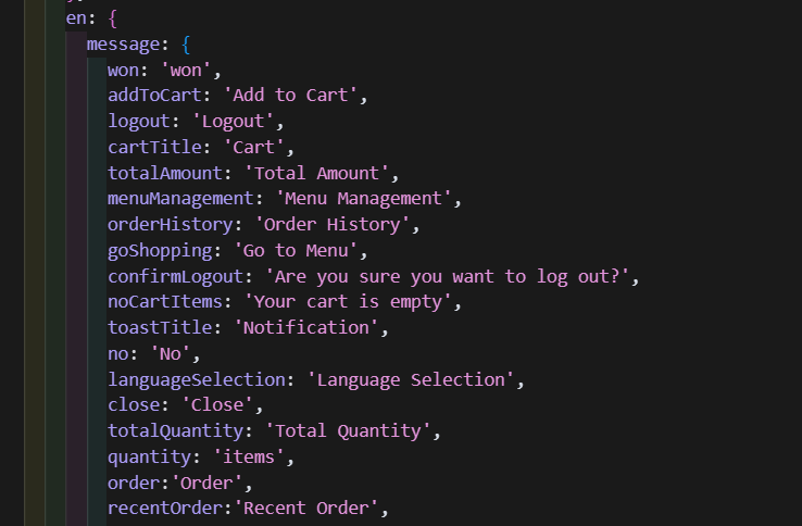아래 코드와 같이 각 하드코딩된 값들 별로, 언어별 값을 대응시켜 놨다. 이 부분의 경우, 일일이 번역을 해줘야 할 수도 있었겠지만 cursor 에디터의 경우 코드 자동완성 기능에서 번역도 자동으로 해줬기에 해당 값들을 그대로 적용할 수 있었다.