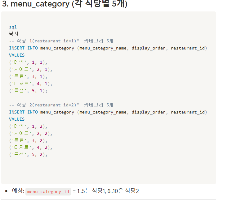 그렇게 GPT에게 받은 DDL 쿼리문을 실행한 이후에는, 실제 개발/테스트 작업을 좀 더 원활하게 하기 위해 각 db 테이블과 컬럼에 더미데이터(테스트용 데이터 (ex. 식당 메뉴, 메뉴설명, 메뉴이미지 등)) 를 넣어주는 쿼리문 또한 GPT에 만들어달라고 했다.