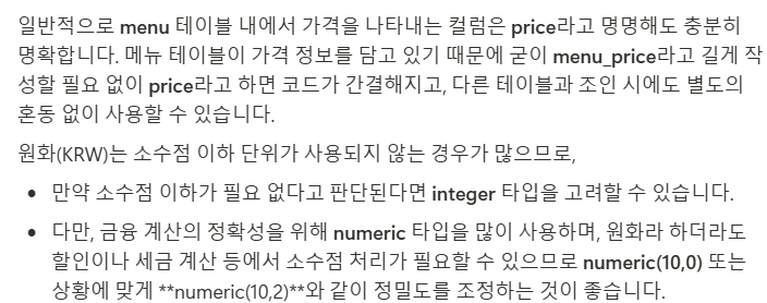 - 메뉴 가격과 관련한 컬럼을 integer 타입 대신 numeric으로 해야 하는 이유는 뭔가?