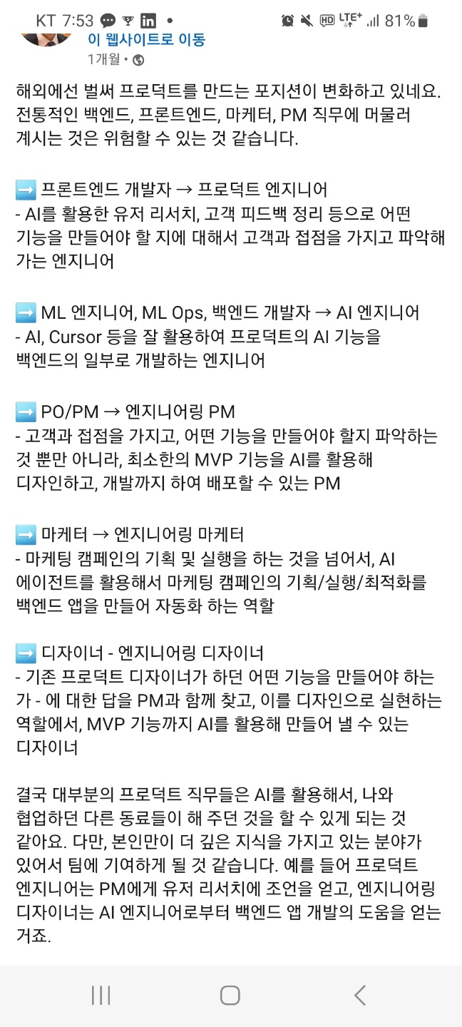 실제로 아래 사진의 링크드인 글처럼, 해외에서는 PO/PM 직무 대신 *엔지니어링 PM이라는 직무를 뽑는 기업들도 생겨나고 있다고 한다. (*엔지니어링 PM: 최소한의 MVP 기능을 AI를 활용해 디자인하고, 개발까지 하여 배포할 수 있는 PM)
