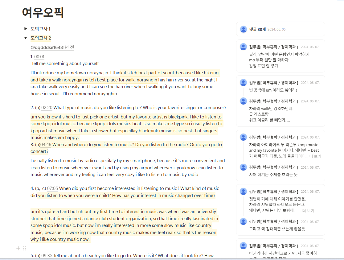 c. 유튜브 "여우오픽" 모의고사 내 답변 녹음해 가면서 풀기. 그 후, 내 답변 옮겨 적어보면서 수정 필요한 부분 체크