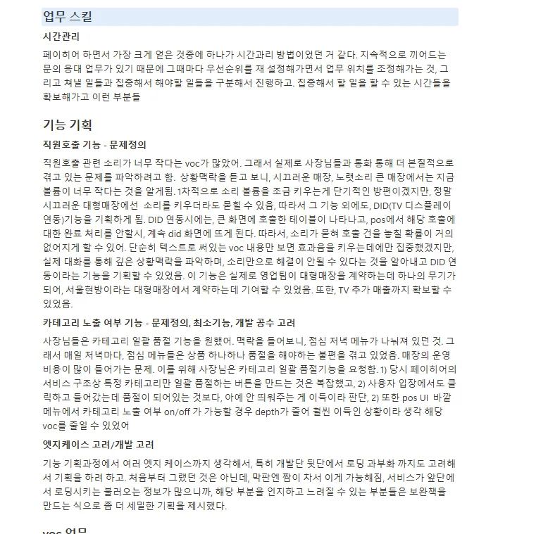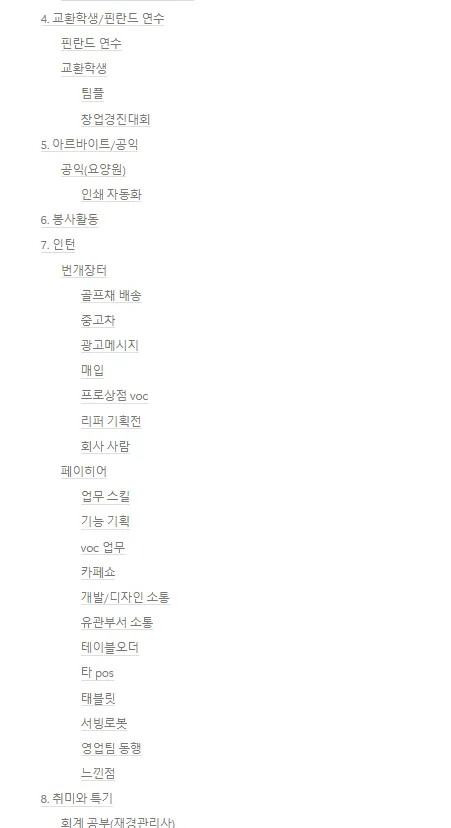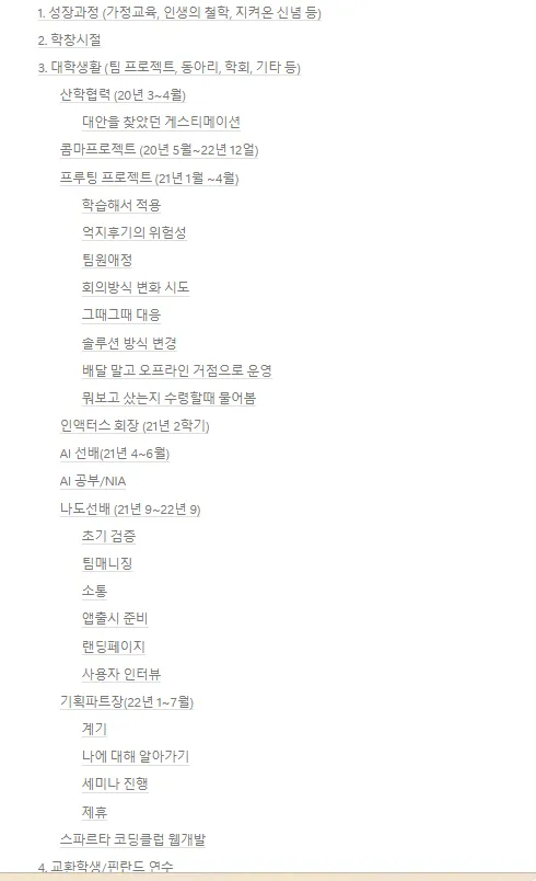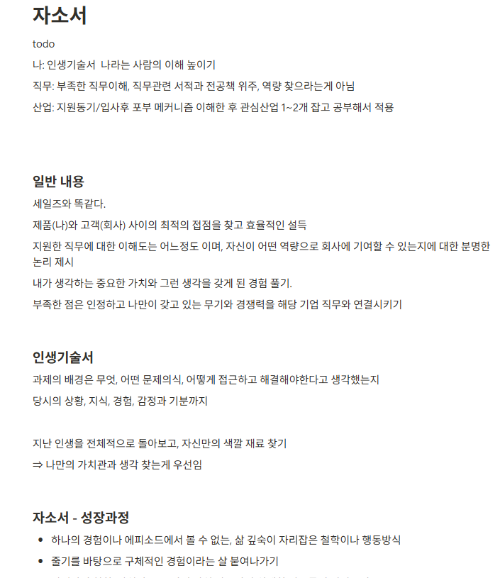 - 나 같은 경우는 나중에 자소서/면접을 준비하면서 추가로 생각났던 소재들도 있었는데 그 소재들을 자소서/면접 준비 페이지에 보관했지만, 그때마다 지속적으로 인생기술서 페이지에 해당 내용을 업뎃해놨어도 좋지 않았을까 싶다