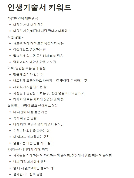 c. 해당 부분들을 바탕으로 "인생기술서에 많이 나온 키워드/강점&\약점/ 취미&특기" 등을 정리 + 관련 경험 리스트업 및 연결