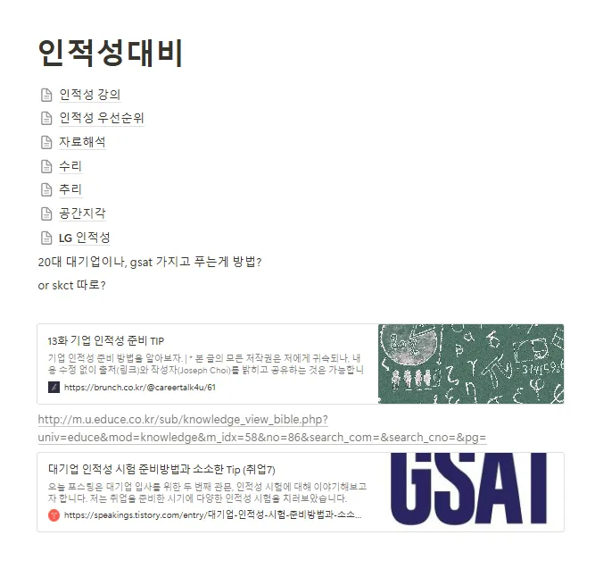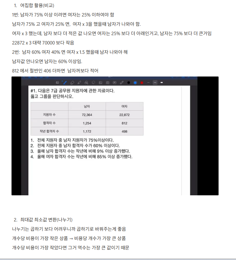 - 그 외로 나는 처음 인적성 공부할 때 시간도 너무 오래 걸리고, 틀리는 것도 많고, 아무리 해도 잘 안 되는 영역이 있었어서 그거에 스트레스를 굉장히 많이 받으면서 했음. 근데 영상 보면서 tip 얻고 하면 충분히 나아지니, 처음부터 인적성 잘 안된다고 너무 스트레스받지 말 것 (가장 중요)