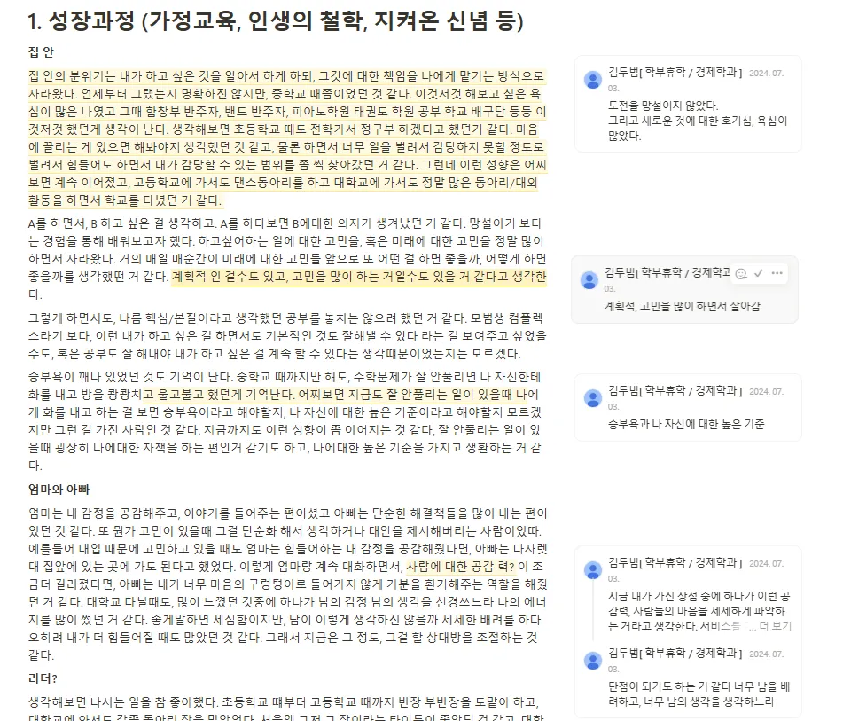 b. 작성한 인생기술서를 다시 읽어보며, 공통적으로 자주 언급되는 성향/인상 깊은 부분들을 댓글로 하이라이트 해놓기