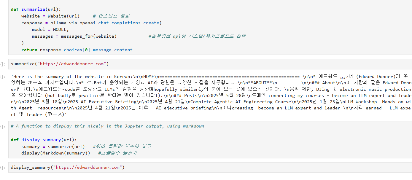 그 뒤엔 Ollama Local LLM을 활용해서 DAY 1에서 만들었던 웹사이트 요약 기능을 구현해 봤다.