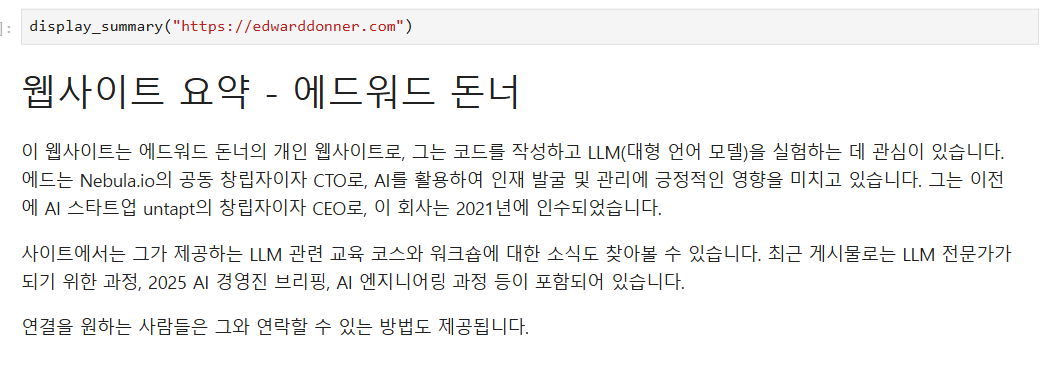 2번째로 진행한 건 DAY1에 GPT API로 실행했던 웹사이트 요약 flow를 Ollama를 활용해 로컬 LLM으로도 실행하는 것이었다.