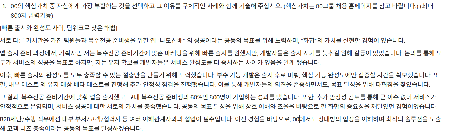 (ex. "가장 큰 실패 경험은 00을 통해 xx의 중요성을 배웠습니다" , "00 앱 출시 과정에서 갈등을 해결한 경험이 있습니다")